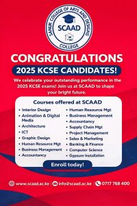 Sanuk College of Arts and Design (SCAAD College) warmly congratulates all 2025 KCSE candidates on the release of your examination results. This important milestone is the reward of years of hard work, discipline, perseverance, and sacrifice. It marks not an end, but the beginning of a new and exciting chapter in your academic and professional journey.